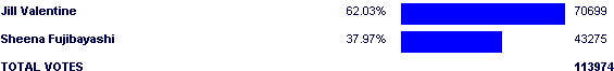 As for the actual match, the final numbers are a bad indicator of certain things; namely, Resident Evil being terrible with the day vote. We all knew how bad it was when Street Fighter managed to make a match out of its loss to RE in the series contest, but Jill doing similarly badly against Sheena was just ridiculous. And remember, we've seen RE vs TOS before in the form of Lloyd needing the day vote to really finish off Wesker.