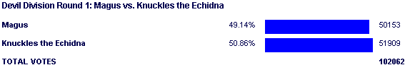 The funniest thing about this match is that despite Magus catching the evening vote and taking off almost 1000 votes (rambling of a possible Magus comeback appeared every time Magus went over the necessary tie quota, but Knuckles was easily able to hold him off) from Knuckles's peak of 2700, Magus would still go down as arguably the biggest choke in the history of these contests. Even ytmnds were spawned from this match, with maguslosttoknuckles.ytmnd.com being the funniest.