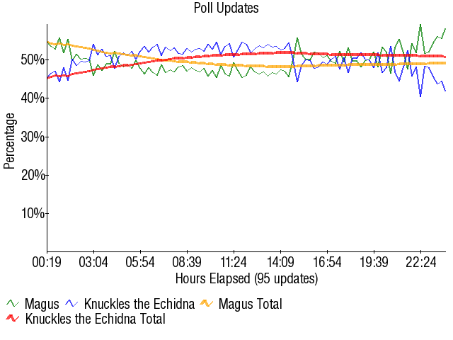 Knuckles shocked the world not far after Magus's increase was stalled, and Knuckles soon began to slowly chip away at Magus's lead just a couple of hours into the match. It took seemingly forever or Knuckles to gain any large updates, but Knux was able to chip away piece by piece at the lead that Magus built early on. It took seemingly forever for Knuckles to get the lead just from 650 to 400, but it didn't take much longer for the vaunted Knuckles day vote to take effect. However, around six hours into the poll, after Magus's flat-out pathetic vote intake all but cost him the match before three hours of the match were over, the vaunted Knuckles day vote began to take full swing at the overrated Prince of Zeal. Votes began pouring in for Knuckles, and what was once a mighty struggle turned into child's play for Knux.