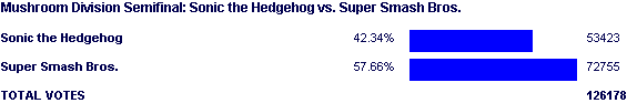 Added to this was the fact that SSBM wasn't all that impressive in the games contest, and this match was essentially SSBM versus the entire Sonic series. It only beat MGS2 by 10000 votes, Vice City by 5000 and FFX by ~1500 before Starcraft got caught cheating against it. From there, it was 37% against FF7. Far better than most other games could hope to get, but still not overly impressive. All it really did was avoid a doubling at the hands of what may no longer be this site's strongest force.