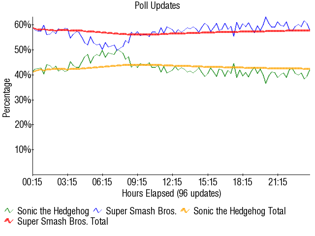 But as it stood, Smash put a choke hold on Sonic that it would simply not relinquish from start to finish. The percentages barely moved in the match save for Sonic's day vote chipping away before Smash brought it back up again during the afternoon and night, but it was meaningless. The percentages you see above are essentially the essence of what this match was from start to finish -- the prototypical debated-match turned-killing-by-debated match-standards kind of blowout. Not too large on paper, but given what Sonic had going for it going in, this was nothing short of yet another disappointment for Sonic. And he has a long line of them in these contests. Only Knuckles has really done much, in retrospect.