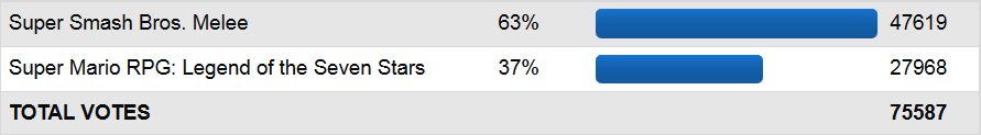 I wonder how many people would have predicted that out third place battle would be between these two. It's almost certainly less than 1%. Only slightly less than 7% predicted Melee to reach the semi-final and only 3% predicted Super Mario RPG to reach that point, so the amount of people that had both things happened and had both games losing has to be very minimal. The final score today looks really nice, as it's just whole numbers.