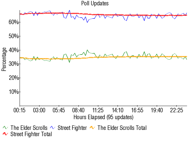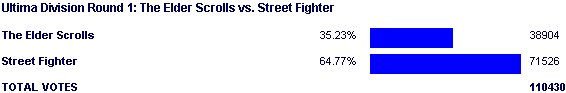 Essentially, TES fans were banking on Oblivion's insane popularity to give TES the match. Never mind the fact that PC and Xbox gaming on GameFAQs is laughable compared to the popularity levels of the consoles Street Fighter has seen, namely SNES, Genesis and Playstation 2. There's also the fact that Street Fighter is an accomplished series that most everyone has experience in, while TES is a niche RPG series. I've said this a million times, but once can't hurt if it helps to hammer the point into a few more thick skulls: non-Square RPG entities will tank in contests. Period, end of discussion. Oh, and bringing up the FAQ Top 50 list is completely irrelevant. Stop doing it.