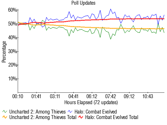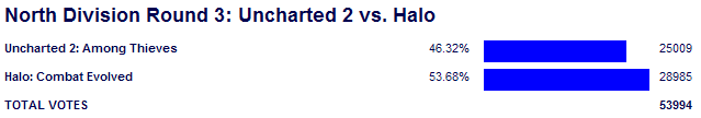 That turned into a near 54-46 match over the next 11 hours, thanks to Halo staying at or just below 60% intake for a good deal of updates. Even with this Uncharted 2 had a pretty good contest, but you can't help feeling sorry when someone or something is on the receiving end of one of Halo's steroid ASVs. A lot of people breathed a sigh of relief the Fallout 3/Halo match was a night match, because no one wants any part of that ASV.