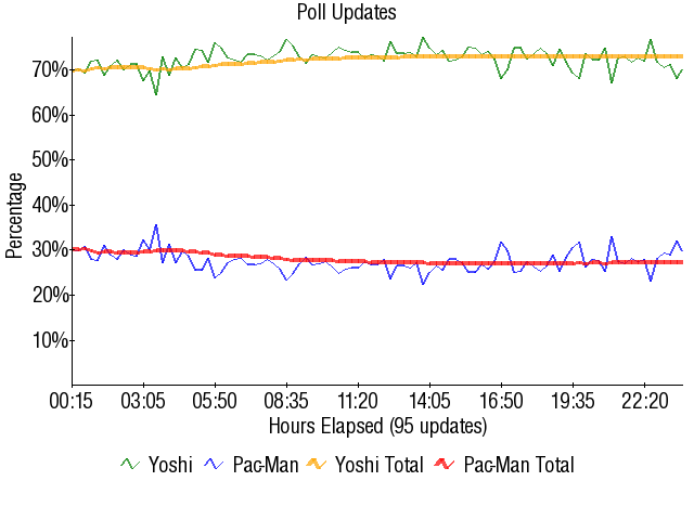 One barely needs to analyse this match to assume why it happened the way it did. The only thing Yoshi really needed to worry about to avoid being embarrassed was to outdo Luigi's performance on Pac Man last year, and some people were actually fearing that Yoshi would not be able to pull it off for whatever reason. Something about Luigi's true strength having always been hidden and Yoshi rSFFing him in 2004 or some such nonsense. On another note, this was one of the most consistent (see also: boring) matches of all time. Yoshi's highest percentage caught by the updater was 73.26%, and his lowest 69.77%. I'm not sure if this small range is a record, but maybe someone like TRE feels like wasting the free time to confirm <_<