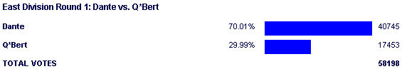 This match was all about how well Dante would stack up to Crono in the second round, because no sooner did Crono's match end did the Crono/Dante hype start piling up. And after Dante's expected thrashing of Q*Bert was over, there was no reason to believe that we weren't in for an epic in the second round. Both Crono and Dante had similar odds of winning the contest and similar prediction percentages. Crono may have had an advantage both in total votes (in his poll) and direct votes (for himself), but at the time, this didn't matter. 2002 wasn't a contest where you could pinpoint percentages with Xsts, so to the board, Crono/Dante looked like it would be quite the epic after the two characters were done dispatching their first round opponents in similar fashion.