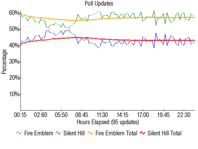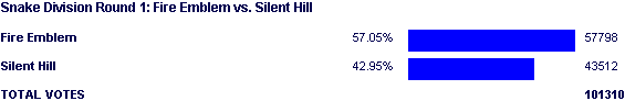 And lose it did. Fire Emblem started the match on fire (lolcwuti.... oh screw it), saw its percentage level off below 60, then proceeded to win in rather typical "stinker" fashion. It increased its lead easily, lost an update every now and then, was never in any real danger of winning, and finished with a 57-43 blowout win. Cue mass whining from Silent Hill fans who overestimated the mainstream value of their series carrying over to a GameFAQs poll. And for the millionth time, a movie or TV commercial or whatever doesn't matter without the popularity of games to back up said appearances.