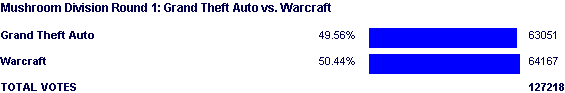 Anyway, to the point. If World of Warcraft doesn't exist, I maintain that the echelon goes Starcraft > Diablo >>> Warcraft in the United States, and I stand by it. However, WoW does exist, which is the one thing that made this match interesting. WoW was perhaps the ultimate wild card due to its rallying potential alone, what with its 6 million players (though I'm not sure how many of them are regulars; a veteran of the game would know that better than I) at the ready. Not to say that we'd see 6 million votes in a poll, but if Warcraft managed to survive the initial GTA onslaught that everyone knew was coming, then the odds of it losing a close match given the fanbase of the most popular game was slim to none, assuming the players felt like taking time away from their busy raid schedules and all.