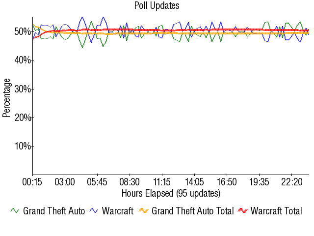 One could have called the match over right then and there. And even if you didn't want to go that far, you could have called this match over after it was an hour old. GTA jumped out to an expected early lead via a huge bracket voting rush, to the tune of 337 votes. 10 minutes later, GTA's lead was down to 200. Given the amount of rallying that was to take place throughout this match, there was literally no way Warcraft was going to lose this if the match turned out to be close. Well, it turned out to be close. Cue what was literally the most boring close match of all time, because everyone saw what was coming hours before it happened.
