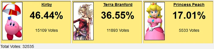 As for this match, it was bound to be predictable, but Terra doing this well was just nuts. We all kind of had a feeling Peach would leech from Kirby pretty hard and Terra would do well thanks to Dissidia and her recent history of overperforming, but even then this was just silly. I hate using the 1 on 1 logic with 3ways here, but does anyone have Kirby only getting 56% on Terra 1 on 1? I know Peach messes up those stats, but even 60-40 just seems crazy. Terra has been beasting since Dissidia, although Kefka getting all the upsets instead of her kind of sucks. Terra is awesome, Final Fantasy 6 might be the best game in that entire series, and Terra's design upgrade from FF6 to Dissidia is one of the best upgrades ever. I know it's technically the same colors, but man does she look good in 3D.