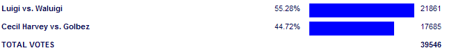 This match is the best proof for how bad this contest was. For like two full rounds, this was our closest match. Yeah, a Waluigi win was our closest match for all but like the two final weeks of a contest. Just screw me in the eye with a spoon, and I actually like Waluigi. But he and Luigi are not rivals, and this is a good example for the bad contest format. Why couldn't we have Mario vs Luigi AND Mario vs Bowser AND Mario vs Sonic? It's not terrible.