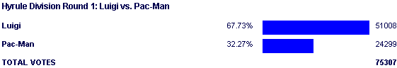 I almost have to tip my hat to Pac Man here. He has fallen off dramatically since his days of being a 1 seed in 2002, but so long as he is still here, he is still going to put up decent numbers against good characters. He isn't elite by any means, but he is surely not 13 seed material either. That said, getting doubled up by Luigi is not good, considering how badly Luigi's stock will suffer by the time all is said and done. Pac Man may be respected by most gamers, bu the fact of the matter remains that he has gone from a 1 seed to a 5 seed to a 9 seed to a 13 seed in four contests. He may be hard-pressed to make the field next year, and after that, he might be gone from the contest forever. He has yet to recover from losing to Scorpion back in 2002, when you think about it.
