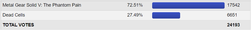 MSGV was certainly getting anti-voted a bit here. Not as much because of the actual game as its just voting against Konami. Despite that, it managed to outdo the boards expectations a little bit. Some probably thought it would be hurt more from all the backlash. Others probably put too much faith in Dead Cells after good showings by indies this round. Dead Cells is released around the time that appears to be the preferred time to be released for indie games, but it didn’t do it much favor. It just didn’t quite hit the big scenes. I’m sure MGSV got a lot of franchise name votes from the forced voting. If Dead Cells couldn’t look better than this against MGSV then its playrate is probably very low. Despite Yakuza 0 looking good today, Metal Gear Solid V would still come into round 2 as the unanimous favorite to win and into round 3 as the unanimous favorite to lose, so it’s not like it made a huge difference that it did slightly better than expected.