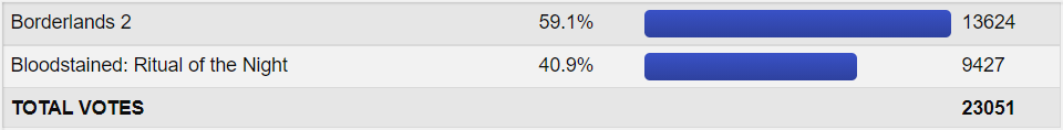 So for the match. The crew actually gave it lower win percentage(okay except Guest)and I don't know why. Sure we have a spiritual successor to Castlevania which is so popular that it coined the term Metroidvania but the Castlevania series is dead. The last game came out 6 years ago. Nobody cares anymore. Oh wait we have a pachinko Castlevania so all are fine I guess. Everyone knows the Borderlands series. The last game came out in the previous year. So name recognition for sure. I didn't know about Ritual since I don't play Indie games and I had to look it up. But Bordelands series? Too famous now. However B2 didn't even managed to break 60% which I say it is a moral victory for Ritual. Ritual is a good game from what I have gathered at least.