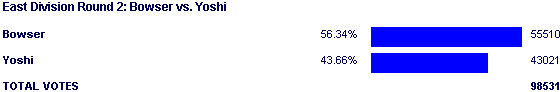 This all caused Yoshi to be the clear favorite in this match, and for the first few seconds of the poll he was in the lead. His lead was very slim however, and within a few minutes Bowser was able to catch up to Yoshi before laying an SFF beatdown on him throughout the rest of the match. It wasn't a Mario/DK type of a beating, but it was enough to ensure that Yoshi had no chance of winning the poll after only enjoying his lead for a few seconds.