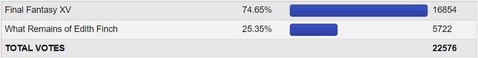 So a FF game and it won! Typical for this site am I right? Now even though I am a HUGE FF fan I still haven't played FF 15. I don't know it just doesn't impress me? I am not sure. The general consensus is that it is a good game but for 10 year development not good enough. As for Edith Finch it is a walking simulator game and I still don't understand how these games keep getting made. Sure some have good stories but seriously? These aren't for me so maybe someone that is into them can tell me.