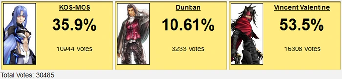 Here's Vincent Valentine who was once thought to be a Noble Nine-breaking monster not being able to double KOS-MOS. And damn, look at his match pic! It's dope as hell! Not that it mattered much because most people just voted from the results page anyway. Picsmithing is a dying art. RIP.