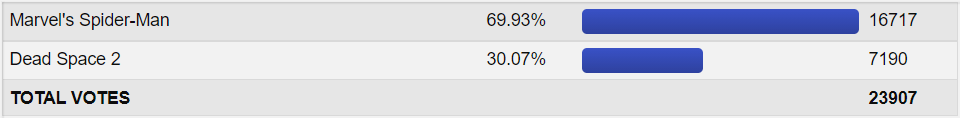 Most of that is in the other two matches, however. I must admit had to look up Dead Space 2 to remember what it was other than “some horror game”. It was well enough received sure, but it’s not something that we care a lot about here and I’m sure I’m not the only one to have forgotten about it. Dead Space 3 did happen, but it wasn’t as popular and the company that made them has shut down since then. Dead Space 2 came out back when the whole world was incredibly excited about horror. We are that a lot less today. It had a lot of things going against it, but it wouldn’t have won either way. The first game got nowhere near beaten San Andreas a decade ago, a result that looked fine until Golden Sun made the upset the following round. The second appears to be the most popular so maybe it could’ve done alright if it was in a contest 8 years ago. All things considered, breaking 30% here was the best it could realistically hope for. It was below expectations, but Spider-Man ended up looking better than people thought, so this was honestly good for it.