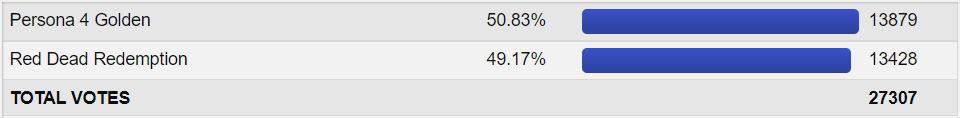 Extremely close match and I didn't expected that. I don't think anybody expected that to tell the truth. Even the crew had P4G winning by around 54 and it made sense. The both faced weak games on the 1st round and RDR is HUGE! Like really huge. The sequel isn't even out for 6 months and it has sold already tens of millions of copies. P4G is an updated version of P4 and it is on Vita! Yeah a Vita game reached round 3! What are the odds of that?