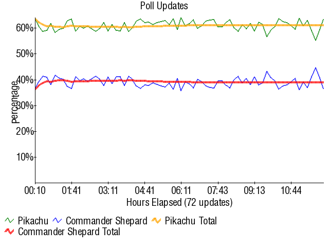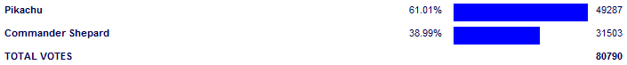 So the match starts. There was mild hype for Shepard pulling an upset here, but most reasonable people knew this would never be in doubt. Nor was it. Pokemon doing well a day match in the Winter 2010 Contest was as sure a bet as the sun rising in the east. That said, Pikachu didn't go out and crush the guy. The percentages stayed almost the same all day, which meant no insane trends or Pokemon ASVs. It was a good win for Pikachu, considering this was his first non-SFF 1v1 win since 2002.