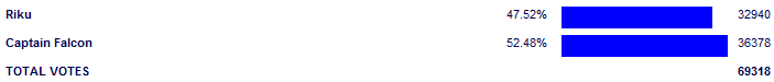 Riku was the favorite and the smart pick, and deservedly so because of this being a KH character during the day, but Falcon just totally punked him in this match. Riku never got his feet under him and looked pretty bad for getting 47.5%. Even the vaunted KH day vote did little for him, making it reasonable to think an ASV wouldn't have mattered here. He won very few updates all match, and updates he did win were scarce. Falcon win this convincingly, leaving no doubt at all about his legitimacy.