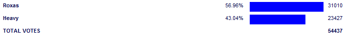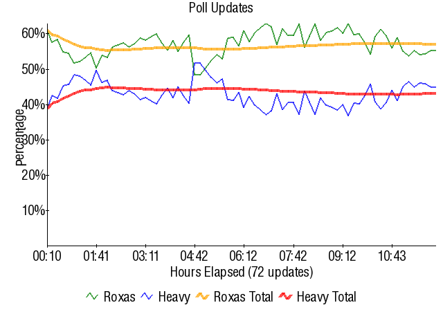 This was a really strange match. Roxas was a lock to win it, but for the second time 4chan decided to have a huge rally for a Team Fortress 2 character. It didn't help Heavy get anywhere close to winning, but he managed to win a few updates overnight and pull Roxas's percentage down to 55% from 61%. Even with how bad Kingdom Hearts characters do overnight, that's a pretty large dropoff. Then the morning vote hit, and Roxas flew back upwards until the end.