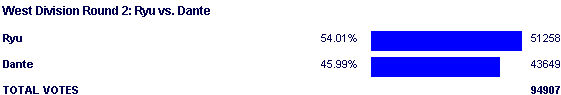 Ryu maintained a steady beating of Dante all through the match, and the final result was one of those polls in which the numbers weren't a true indicator of how dominant Ryu actually was in the match. If anything, Ryu underperformed a little due to being the underdog. This match remains as one of the more boring upsets, simply because there was no outcry.