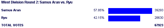 Not that this mattered when the match began, of course. One could have argued that Ryu was done for after Samus's convincing win over Ken Masters in the first round, but they play out the matches for a reason. And when this match was played out, Ryu was never in contention. He may be the most popular fighting character out there, but this is GameFAQs, the land of Squaresoft and Nintendo. Ryu beating Samus would have been nice, but it was clear almost from the first round that Samus would have no trouble winning this match.