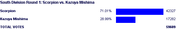 In our first matchup featuring two fighting game characters, Scorpion won as expected. The prediction percentage and odds favored Scorpion to win with ease, and win with ease he did. The intriguing thing, however, is one of the site's earliest poll results: