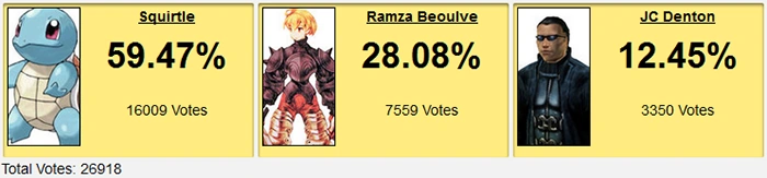 Ramza's since been in a Dissidia game or two, in 2018 he'd probably still do OK. It's not like he impressed here or anything and he did get doubled by a cartoon turtle, but at least he didn't lay down and die. People were expecting much worse of a blowout, which lead to people still championing Dante > Squirtle in R2 as if DmC and Pokefear didn't exist.