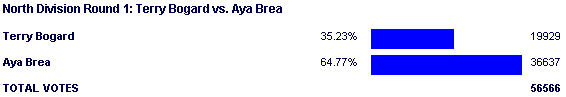 Everyone remembers how bad the Street Fighter 2 whining was, right? Terry Bogard's loss had a very similar effect to it, perhaps even moreso. The Summer of 2002 was the busiest time period that this board has ever seen, and when a ton of Terry Bogard fans start whining, you had no choice but to notice. Not that they didn't have a good reason, mind you. This match took place directly after Morrigan's victory, and it made no sense that Terry would lose all of one day afterwards to an opponent that could not have possibly been that much more popular than Spyro the Dragon. But regardless of all the complaints, it happened, and the complaining continued for quite a long time afterwards. I distinctly remember a "What? Terry Bogard LOST??" 200 post topic being created two weeks after this match. Terry Bogard fans may not be that large in size (obviously), but they're quite the vocal bunch, as are most fighting game fans.
