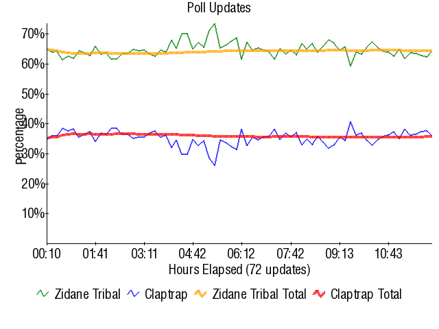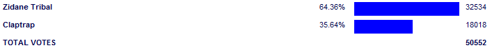 Given Zidane's weak contest history, expecting him to make Claptrap the next Tanner was asking a bit much. But expecting a huge blowout was still reasonable, especially given this was a night match and Zidane would have the full benefit of the Square overnight vote. He started off well enough, then dropped like a rock down to 63%. The overnight vote got him back up close to his final percentage, but it didn't prevent the criticism. Zidane > Ike was a hyped upset pick, but the hype died off once Zidane laid an egg here, especially given upsetting Ike in a day match would be hard enough as is.