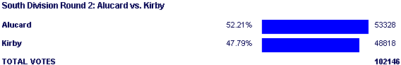 But this wasn't Summer 2002, and people were a tad wiser this time around. It's not that Alucard turned the hype into a 50-50 style board split out of stats or anything; there was simply a certain aura about him that couldn't really be explained when compared to Kirby's miserable 2002 showing. It should be noted however that even though I'm making it sound like Alucard was the clear favorite going in, he wasn't. At best it was a dead even board split, though more people seemed to favor Kirby winning this match. I'm simply saying that a lot more people would have been on Kirby's side if the events of 2002 weren't taken into account.