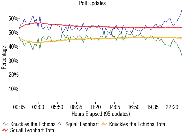 However, this... was put to rest rather quickly. The "bandwagon" votes put Knuckles ahead by a few votes early on, but Squall was quickly able to recover and begin building a lead. He actually soared over 57% at one point, and though the famous Knuckles day vote kicked in at the expected time, it did not deter Squall from increasing his lead. He had built a lead of almost 2000 votes come 8:00 AM EST, and though Knuckles was able to cut into Squall's percentage come showtime, Squall was easily able to increase his lead and stem any talk of a Knuckles comeback. Knuckles' percentage slice was impressive in that he was able to bring Squall down from being over 57% to what you see above, but he did very little about Squall's lead increase. The best Knuckles was able to do was to either go 50-50 with Squall or win a few small updates every now and then. By the end of the match, Squall would end up winning by over 7500 votes. Pretty impressive, given that some expected the upset.