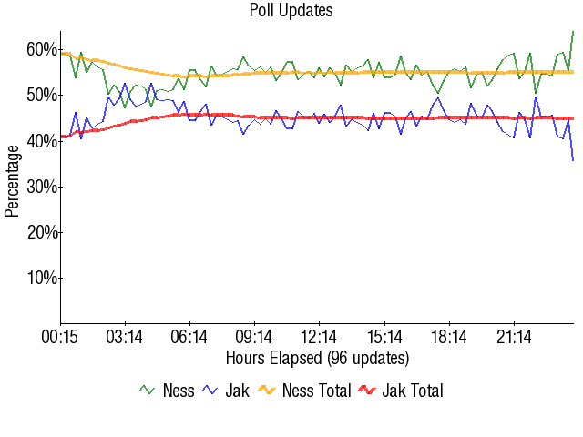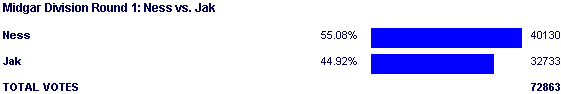When the poll started, Ness jumped out to a quick 1000 vote lead, and after the early morning vote kept the vote margin tied at 1000 for a time, the day vote favored Ness. He caught fire during that time, and rode the momentum all the way to a 55-45 blowout. I call this a blowout simply because if you went by board polls and/or BOP numbers, this poll was supposed to be dead even. The reality is that many people underestimated Ness simply because Ness, as well as Earthbound itself, bombed in past contests. But like I've said in every match involving them, no one cares about 3D platformer characters anymore. Jak is just another 3D platformer to this site, and he is no exception to the trend. His games may have sold well, but so did Tanner's. And Tanner is still trying to pull little pieces of shrapnel out of his skin over in the corner.