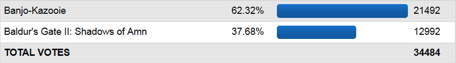 I really don't think there's anything noteworthy about this match. It went pretty much exactly as you'd expect. I mean, I'm sure Baldur's Gate has a little support, because Banjo sucks in contests, but while he's not the most interesting character, this game sure isn't lacking. This match also went completely ignored for most of the day because the other three matches were either really intense to follow or a surprisingly big blowout. There was nothing surprising about this. Banjo lived up to expectations, though I guess for the few people that believed we would see N64 games dominate and had Banjo advancing past SotN, this probably wasn't what they wanted to see. Not only did SotN get as close as it comes to tripling Trials and Tribulations, Banjo would need to exceed expectations in the first place to make the round 2 upset seem likely.