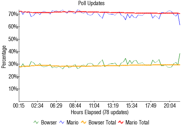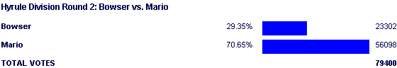 I'm sorry, but look at the second round prediction percentages for the Hyrule division. With the exception of Yoshi/Luigi, every match in this division was literally predetermined for two rounds. This isn't just boring, but it's flat out wrong. And what was the point? To give Link the easiest road possible into the finals? To set up Mario vs Crono 3? Most people knew for a fact that Mario was going to make it into the Hyrule Semifinals, and those who didn't were likely filling out joke and/or zero brackets. As for those who actually believed in the OMFG MARIO VS BOWSER HOW INTRESTING!1!! nonsense, I feel sorry for you. All three of you.