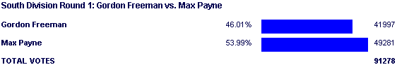 Fun fact. In terms of final percentage, this is the closest that Gordon has ever come to actually winning a match. Ceej has gone the "stick Gordon against a generic male character with two names" route twice since, but Max Payne fit the whole near-miss thing for Gordon the best.