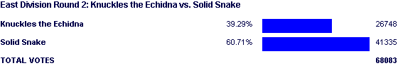 The other funny thing is Knuckles would prove over the years to be a total round 1 monster, with his only loss coming in the dreadful fourway contests (https://gamefaqs.gamespot.com/poll/3250-division-2-round-1-fei-knuckles-mario-zelda), and not one time has he ever made it into round 3. It's a crime we never got to see Knuckles vs Tidus in round 2 to get one of them over the hump.