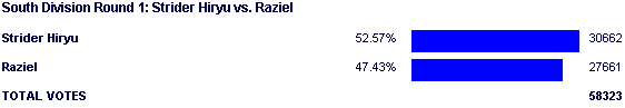 Of course, one look at the final vote totals shows that this was one of those fodder vs fodder matches that no one but the bracketmakers cared about too much. Strider and Raziel have decent-sized fanbases, but both them and their games aren't exactly household names on GameFAQs. The result? A boring, low-scoring match that was barely in doubt despite how close it seemed. Strider had the match on lockdown the entire time, and despite the final vote totals being so close, that was a result of the low vote total moreso than Strider's difficulty in handling the match. This match was so low-scoring that Strider set (and still holds) the record for least impressive contest winner. Winning a match despite only scoring 30,000 votes says a lot about both characters, but more about Raziel. He may not have been favored to win the match, but his odds of winning the contest were far better than Strider's. Considering that this was a very winnable match for Raziel, him never being in it was a disappointment.