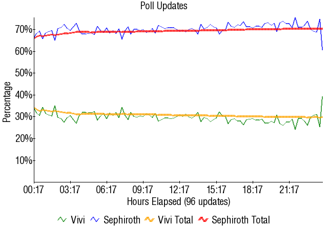 Since everyone already knew that Sephiroth was going to win the match, the only thing to really look at here is the fact that Vivi did better than most people expected him to. This could mean a few things, the biggest of which is the fact that Square SFF is far more difficult to come by than Nintendo SFF. Nintendo characters have so much exposure and star in so many games that the Nintendo heirarchy is set in stone at this point. While the same ranks are within Square, the fanbases of characters who appear in a game or two each are far more defined. Voters won't simply turn on Vivi simply because he is facing a character from another Square game. Square titles all have a life of their own, and even though Cloud and Sephiroth are undoubtedly the most powerful Square characters, the rest of the pack has enough of a fanbase so that they will likely never get killed by a fellow Square character. This match is a good example of that. Nearly pulling in 30% on Sephiroth is no joke, and Vivi deserves some respect for it.