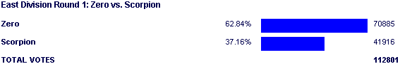 But along came the beginning of the match, and Zero managed to prove that it wasn't Scorpion's strength, but his soft-as-crap half division that led to his run in 2002. This match started off badly for Scorpion and only grew worse, and the only good thing that can really be said about him is that a massive amount of people rallied to vote in this match one way or the other. Nearly 113,000 total votes in a first round match is no joke, but this tends to happen when a heavy favorite starts going down.