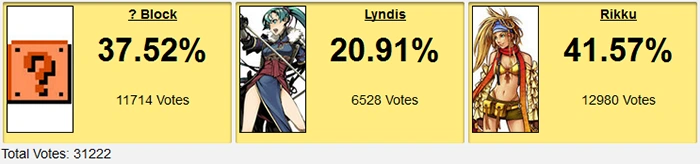 ?-Block was the favorite here because he had beaten WCC, Pong Paddle and then-Champion L-Block in a post-2007 bonus match. That's cool and all, but as discussed above, nobody seemed to care for these joke objects as much anymore, so people started pushing for Rikku in the 11th hour right before this match. People had been pushing her for a while, actually, but a lot of people clung to that bonus poll and stuck to their ?-Block picks.