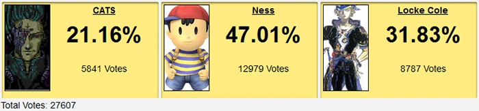I know cross-referring old stats is unreliable, but Ness would ultimately end up scoring 60% on Celes in this poll and we're only concerned about who wins. This match was done within 5 minutes of it beginning for a reason: without Dissidia, Old Square still sucks in contests.