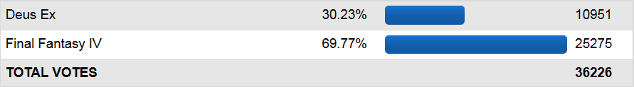 This match was some great karma for that awful Rock Band match where the Deus Ex fans sat around whining for 24 hours about how their game wasn't winning by enough. Final Fantasy 4 beat the karma out of this poll and did us all a favor by taking out the trash in a 70-30 rout right off the bat. I know Deus Ex is a good game, but that Rock Band nonsense means I'm rooting for a massive blowout every time this thing is in a poll. The board really was that bad that day. Good riddance to Deus Ex in this contest and good riddance to those fans.