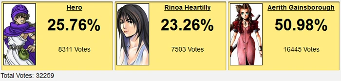 But actually winning a match? Nah. Aeris > Rinoa > Hero was bound to be a lock. Look at Dragon Quest's contest history: