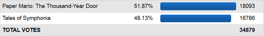 One might argue that brackets gave TTYD the edge, but it only had a little bit more than half of them, I doubt it really mattered. Top option? Not really an issue this contest considering the format put the games next to each other instead. TTYD was simply just slightly stronger. Nothing more to say about it than that. TTYD is one of the four contenders for my absolute favorite game, I find it to be perfection, so naturally I really enjoyed this match. Of the four, TTYD is easily the least popular one, though it's mostly because the others, FFVII, CT and SMW, are among the most popular games out there. When Allen indirectly hinted that it made the contest by stating that he didn't take “the Paper series” into consideration when claiming Final Fantasy had the most entrants, I was already happy enough. Seeing it get a winnable match was really great, even if I knew it'd be blown out next round. I wish the original Paper Mario had got a different bracket placement, which I'll get back to when that match comes, but I'm glad to see TTYD outlast its predecessor this time. It got a much higher seed this time too proving its the favorite! Glad to see we've agreed on that.
