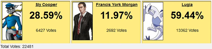 You know Pokemon is becoming truly dominant when characters from beyond the RBY generation start rocking out in our contest polls. I'm willing to bet most of the Lugia voters are Smash Bros fans, which was frankly enough to blow out complete garbage. The more polls I see, the more convinced I am that Average Joe characters with Average Joe names are always going to clog up the bottom of our extrapolated standings. To this day, I have no idea how Nathan Drake has any contest strength whatsoever; he seems like exactly the kind of guy GameFAQs would put to 10% in any poll.
