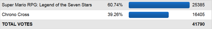 Mario RPG was never going to lose this match regardless of whether it was against Chrono Cross, World of Warcraft, or San Andreas. The only thing here that would be entertaining would be Mario RPG's percentage bleed overnight, and every time it happens I wonder how strong the game would be were it ever released in Europe.