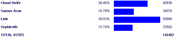Link - 35.56% Cloud - 28.23% Sephiroth - 20.64% Samus - 15.58% |